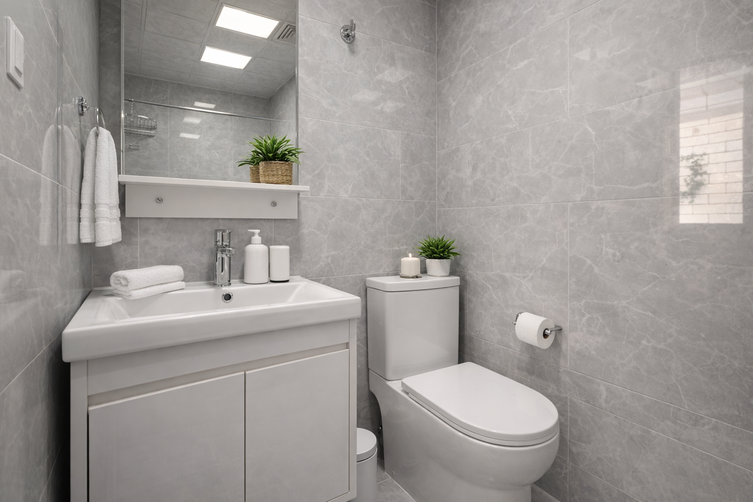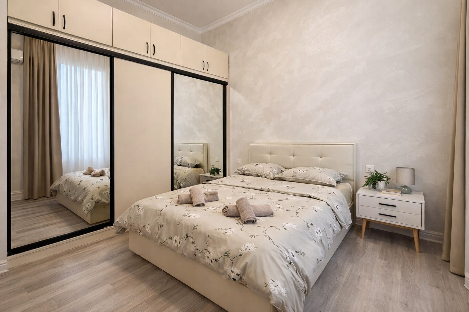 Welcome to your bright and airy home away from home. This freshly renovated, ground-floor suite offers a tranquil escape from the bustling city, designed with a clean, minimalist aesthetic. Enjoy year-round comfort with modern air conditioning and radiant heating. Living Room: Bathed in natural light, this inviting space is your perfect relaxation hub. Unwind on the comfortable dark grey sofa, which easily converts into a double bed for extra guests. After a day of exploring, stream your favorite shows on the Smart TV. Bedroom: Find serenity in the peaceful bedroom, featuring a plush King-sized bed. Large mirrored wardrobes provide ample space to unpack and store your belongings. Kitchen: Your fully equipped, L-shaped kitchen is ready for any culinary adventure. It includes a gas stove, a full-sized refrigerator, and wine glasses. For your convenience, an in-unit washing machine is also available. Bathroom: Refresh and rejuvenate in the modern bathroom, which boasts a spacious walk-in shower with elegant grey marble-style tiling. A hair dryer is provided for your use.